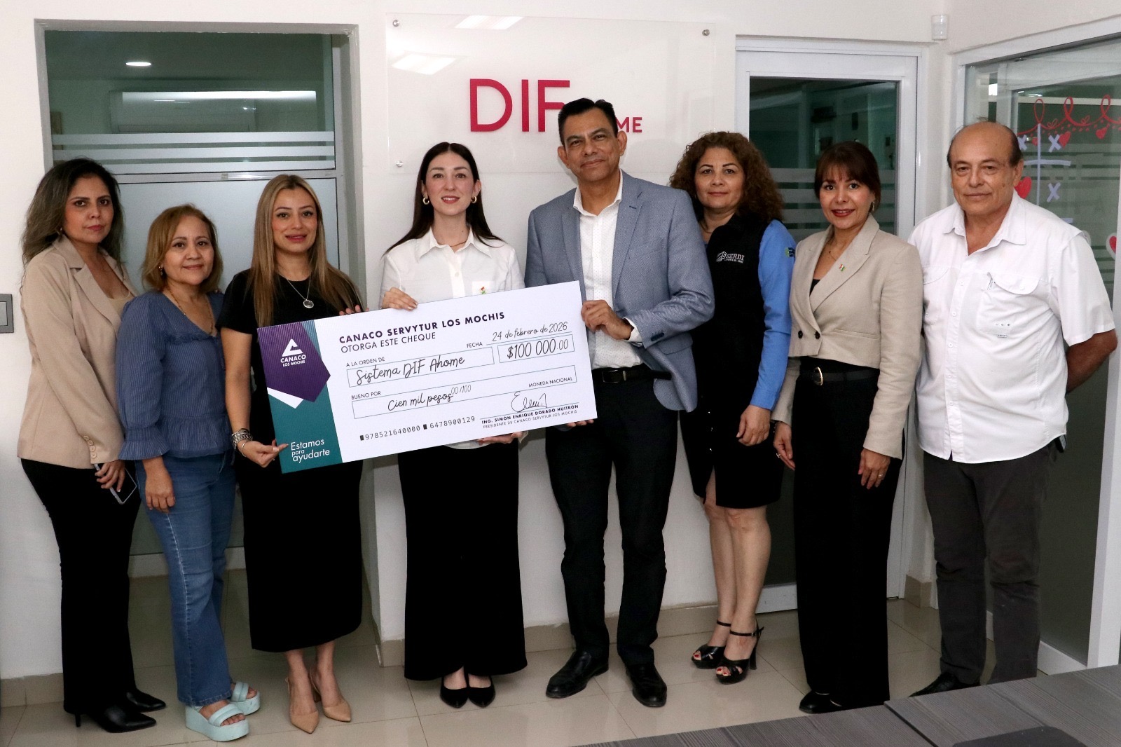 Los Mochis, 25 de Febrero de 2026. La CANACO SERVYTUR Los Mochis realizó la entrega de un cheque por la cantidad de 100 mil pesos al Sistema DIF Ahome, recurso que será destinado al fortalecimiento de diversas actividades artísticas que el organismo desarrolla en beneficio de las familias ahomenses. El donativo fue entregado por el Ing. Simón Enrique Dorado Huitrón, presidente de CANACO SERVYTUR Los Mochis, quien destacó que este recurso proviene de lo recaudado durante la Feria CANACO realizada el año pasado en los patios del Ingenio Azucarero, evento que reunió a comerciantes, empresarios y ciudadanía en general con un objetivo común: contribuir a causas sociales del municipio. En representación del Sistema DIF Ahome, recibió el cheque la presidenta del organismo, MarissaMenéndez de Llano Chávez, quien agradeció el respaldo del sector empresarial organizado y reconoció la responsabilidad social de CANACO SERVYTUR Los Mochis al destinar lo recaudado a programas que impactan directamente en el bienestar de la comunidad. La presidenta de DIF Ahome subrayó que este apoyo permitirá fortalecer talleres, presentaciones y proyectos artísticos que promueven la integración familiar, el desarrollo de habilidades y la sana convivencia entre niñas, niños, jóvenes y adultos. Con este tipo de acciones, CANACO SERVYTUR Los Mochis y el Sistema DIF Ahome reafirman su compromiso de trabajar en coordinación para impulsar iniciativas que generen bienestar y mayores oportunidades para las familias de Ahome. Navegación de entradas Secretaría de las Mujeres presenta calendario 8M: alianzas para visibilizar, empoderar y atender Antonio Menéndez entrega obras prioritarias en zona rural por el orden de los 4.8 mdp
