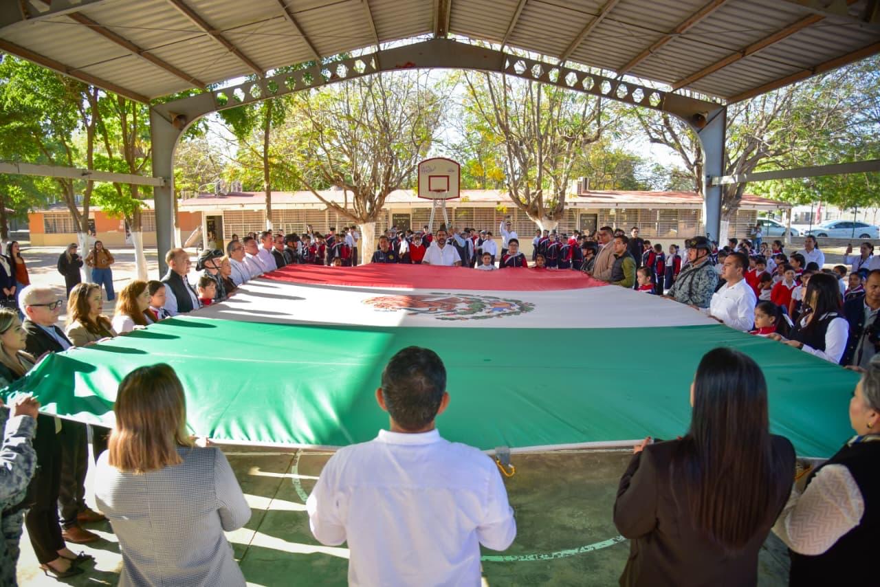 Los Mochis, Ahome, Sinaloa. A 23 de febrero de 2026.- Como parte de la Brigada Educativa Municipal en coordinación con las Jornadas de la Paz, este lunes se realizó el Homenaje Cívico por el Día de la Bandera en la Escuela Primaria Ángel Flores, del ejido 20 de Noviembre Nuevo. En un ambiente emotivo, el Presidente Municipal Antonio Menéndez de Llano Bermúdez señaló que estas acciones nacen de la convicción de que “la educación y los valores son la base para construir un mejor Ahome y, por supuesto, un mejor México”. Subrayó que la Bandera Nacional representa historia y unidad, y que al honrarla se renueva el compromiso de formar niñas y niños con amor a México, con fomento al respeto a los demás y la responsabilidad con su comunidad. El Alcalde añadió que el trabajo se realiza en sintonía con el Gobernador Rubén Rocha Moya y la Presidenta de México, Claudia Sheinbaum Pardo, al impulsar una educación con sentido social y humanista, para que cada estudiante crezca con bienestar, esperanza y orgullo de ser mexicano. La Directora de Educación en Ahome, Kiabeth Medellín Lara, explicó que la Brigada Educativa busca fortalecer el sentido humano, la comunidad y el rescate de valores, además de promover entornos escolares más seguros, solidarios y participativos. Detalló que distintas dependencias municipales realizaron actividades dinámicas e informativas al interior de los salones, con mensajes de conciencia en favor de la paz, y reconoció el impulso del Presidente Municipal a estas acciones. A nombre del alumnado, Alexa Jazmín agradeció la visita y afirmó que ser escuchados les hace sentirse importantes y tomados en cuenta, al tiempo que prometió que seguirán estudiando y esforzándose, y cerró con el mensaje que unió a toda la escuela: “¡Ahome, la casa de Todos!”. Navegación de entradas JAPAMA atiende y resuelve afectación de drenaje en subcolector sanitario de la colonia Rosendo G. Castro La agricultura sinaloense elevará su productividad con el programa de tecnificación de la presidenta Sheinbaum: Gobernador Rocha