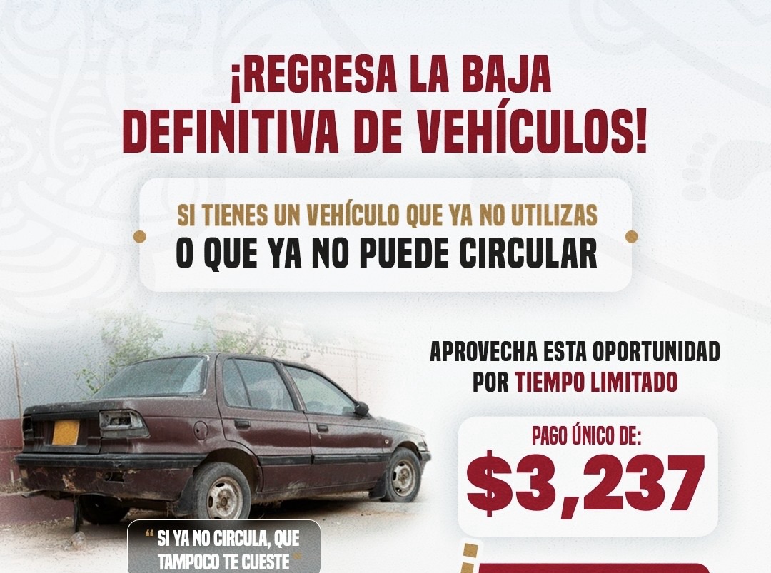A través de este programa, las personas que cuentan con vehículos que ya no circulan o que se encuentran en desuso podrán realizar su baja definitiva en el padrón vehicular mediante un pago único de $3,237.00 pesos, evitando así que continúen generando adeudos por conceptos como refrendo, multas u otros cargos administrativos.
